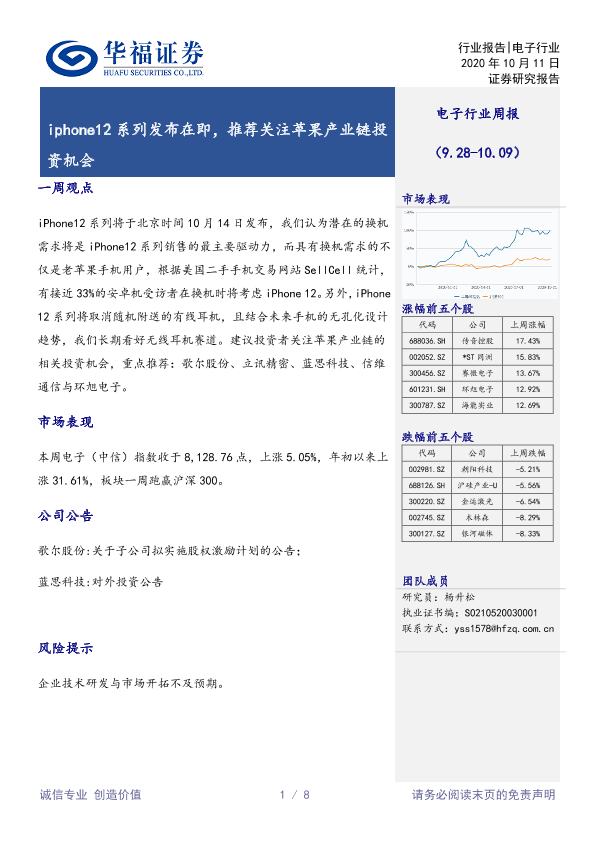 【华福证券】【20201011】20201011-华福证券-电子行业周报:iphone12系列发布在即,推荐关注苹果产业链投资机会-8页