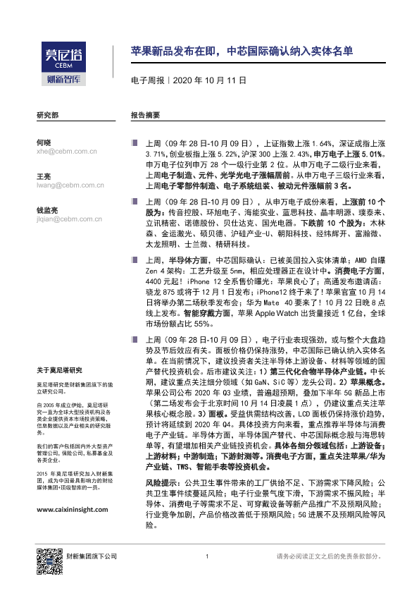 【莫尼塔研究】【20201011】电子周报:苹果新品发布在即,中芯国际确认纳入实体名单-11页