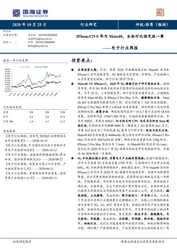 【国海证券】【20201025】电子行业周报:IPhone12VS华为Mate40,全面对比谁更胜一筹-19页