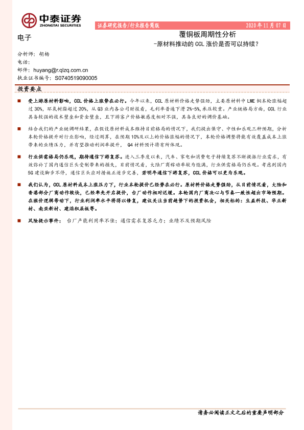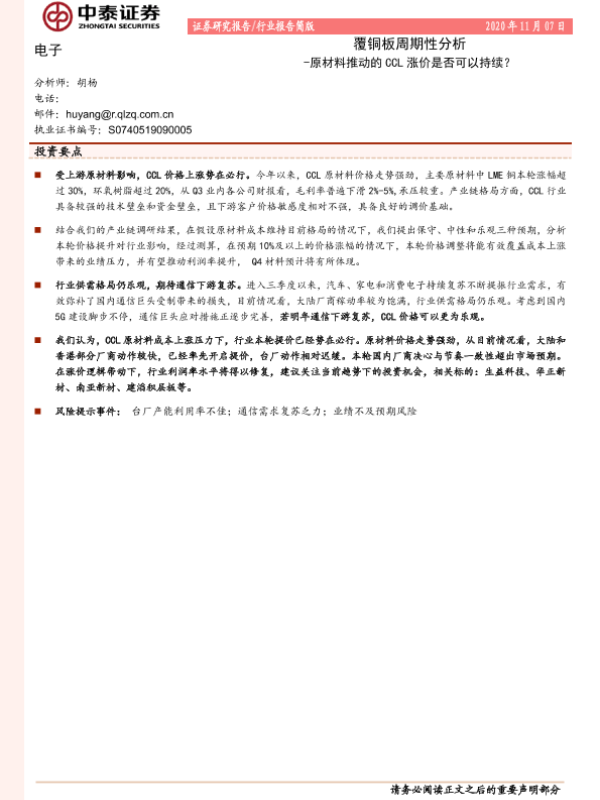 【中泰证券】【20201107】电子行业:覆铜板周期性分析-原材料推动的CCL涨价是否可以持续?-8页