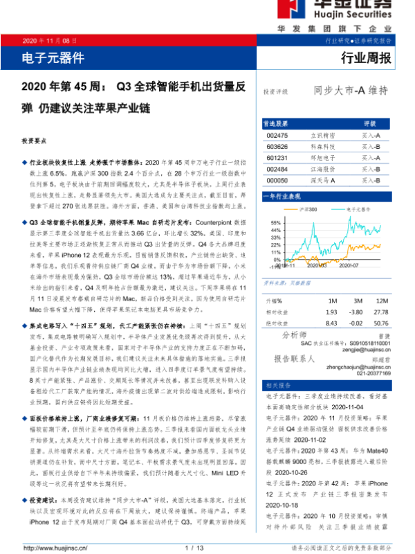 【华金证券】【20201108】2020年第45周:Q3全球智能手机出货量反弹 仍建议关注苹果产业链-13页