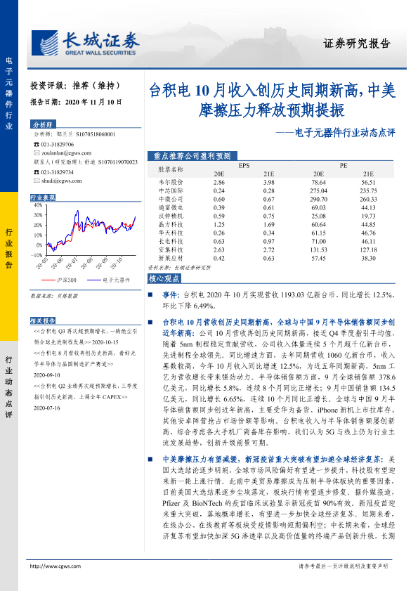 【长城证券】【20201110】20201110-长城证券-电子元器件行业动态点评:台积电10月收入创历史同期新高,中美摩擦压力释放预期提振-3页