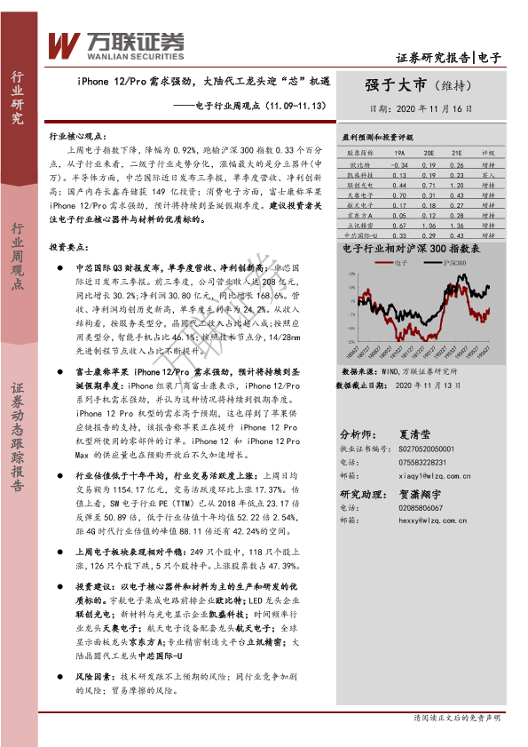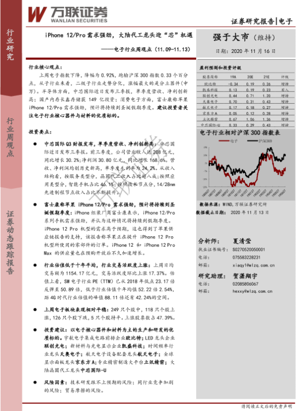 【万联证券】【20201116】20201116-万联证券-电子行业周观点:iPhone 12 Pro需求强劲,大陆代工龙头迎“芯”机遇-14页