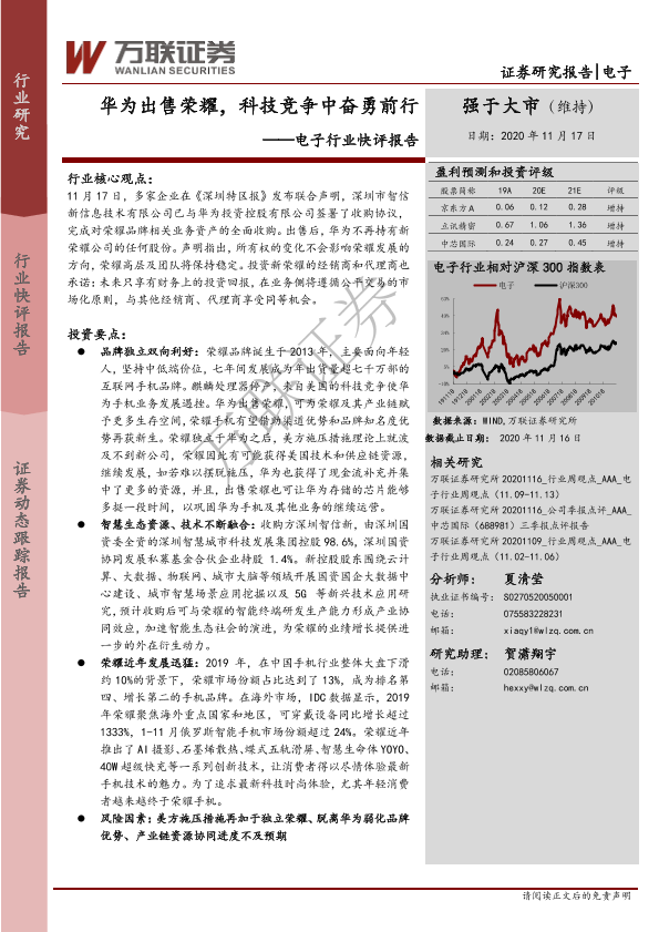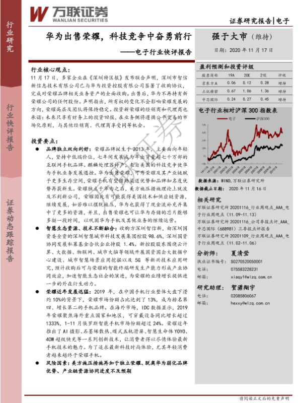 【万联证券】【20201117】电子行业快评报告:华为出售荣耀,科技竞争中奋勇前行-3页