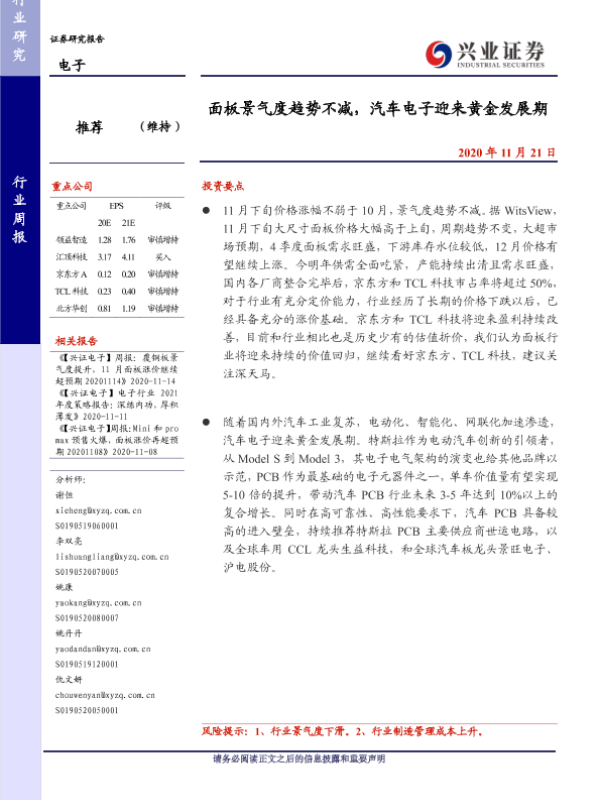 【兴业证券】【20201121】20201121-兴业证券-电子行业周报:面板景气度趋势不减,汽车电子迎来黄金发展期-9页