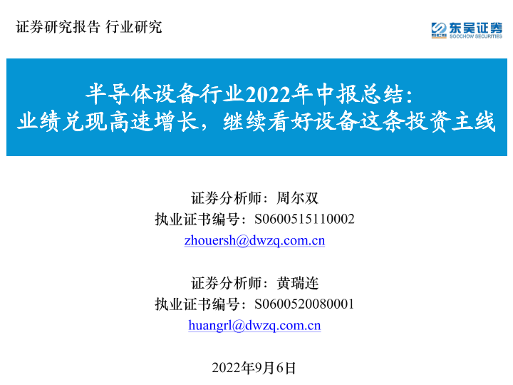 【东吴证券】【20220906】半导体设备行业2022年中报总结:业绩兑现高速增长,继续看好设备这条投资主线-25页