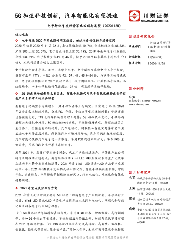 【川财证券】【20201128】电子行业年度投资策略回顾与展望:5G加速科技创新,汽车智能化有望提速-48页