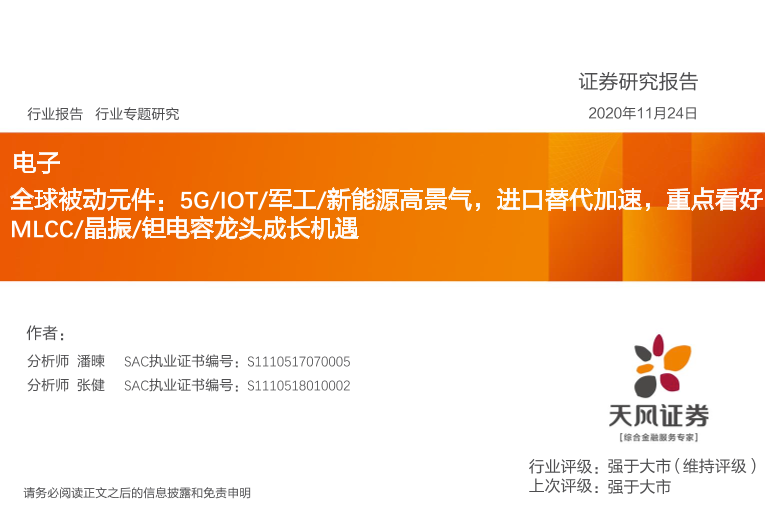 【天风证券】【20201124】全球被动元件:5G IOT 军工 新能源高景气,进口替代加速,重点看好MLCC 晶振 钽电容龙头成长机遇-95页