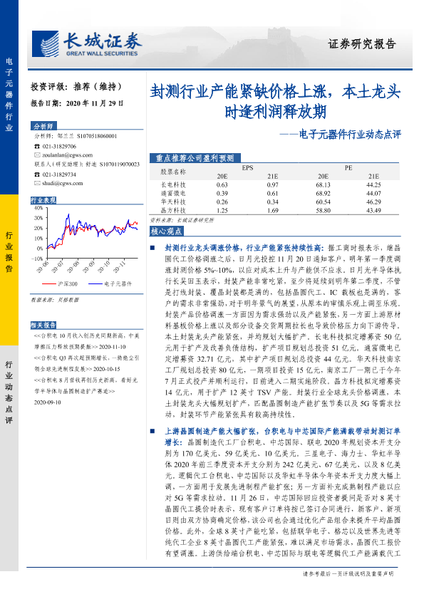 【长城证券】【20201129】电子元器件行业动态点评:封测行业产能紧缺价格上涨,本土龙头时逢利润释放期-3页
