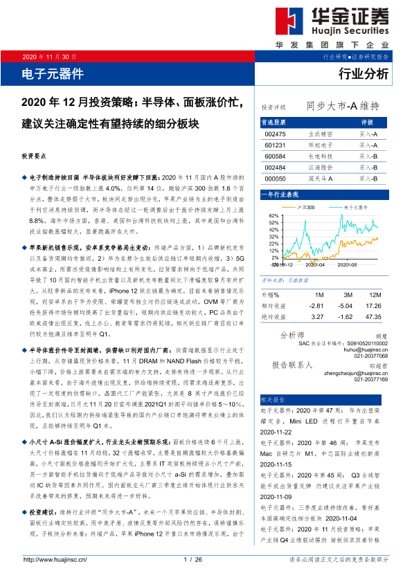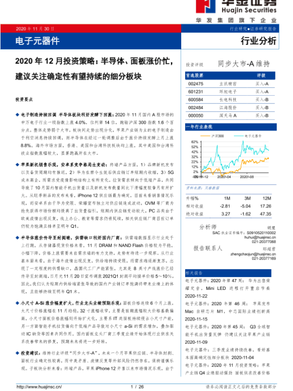 【华金证券】【20201130】电子元器件2020年12月投资策略:半导体、面板涨价忙,建议关注确定性有望持续的细分板块-26页