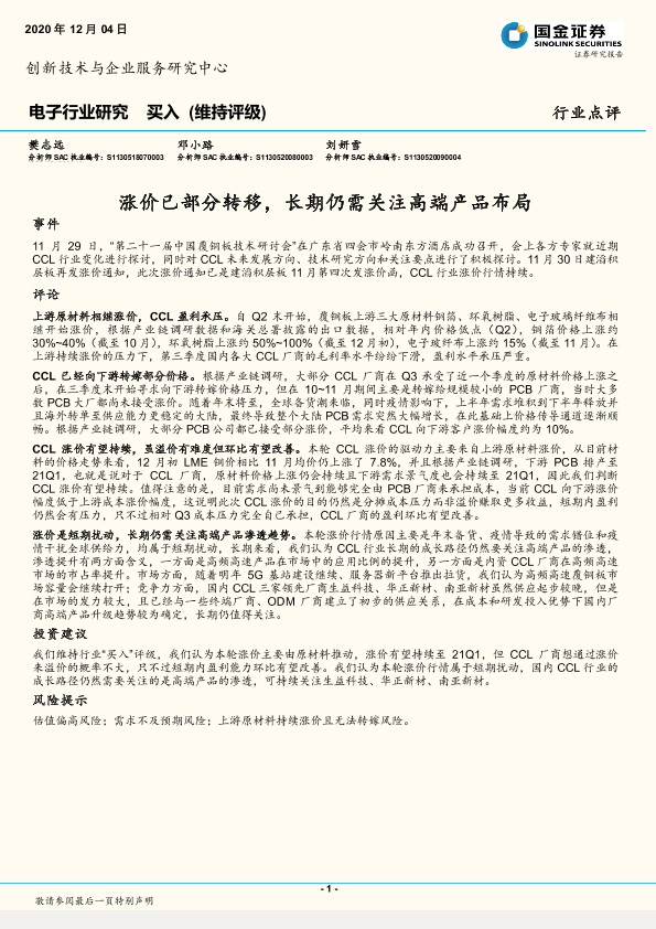 【国金证券】【20201204】20201204-国金证券-电子行业研究:涨价已部分转移,长期仍需关注高端产品布局-3页
