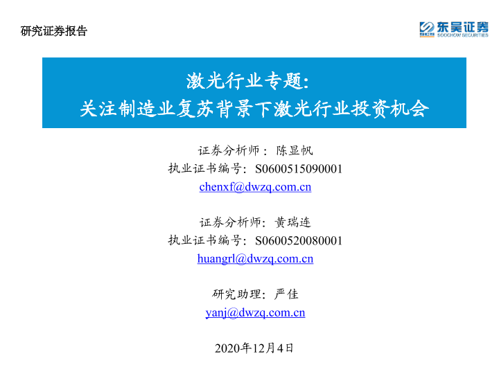东吴证券 制造业复苏 投资机会 激光行业 证券分析