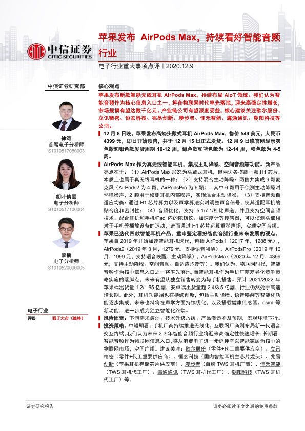 【中信证券】【20201209】苹果发布Air Pods Max,持续看好智能音频行业-3页