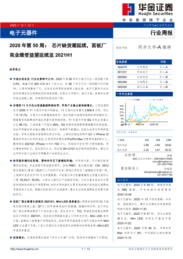 【华金证券】【20201212】电子元器件2020年第50周:芯片缺货潮延续,面板厂商业绩受益望延续至2021H1-13页