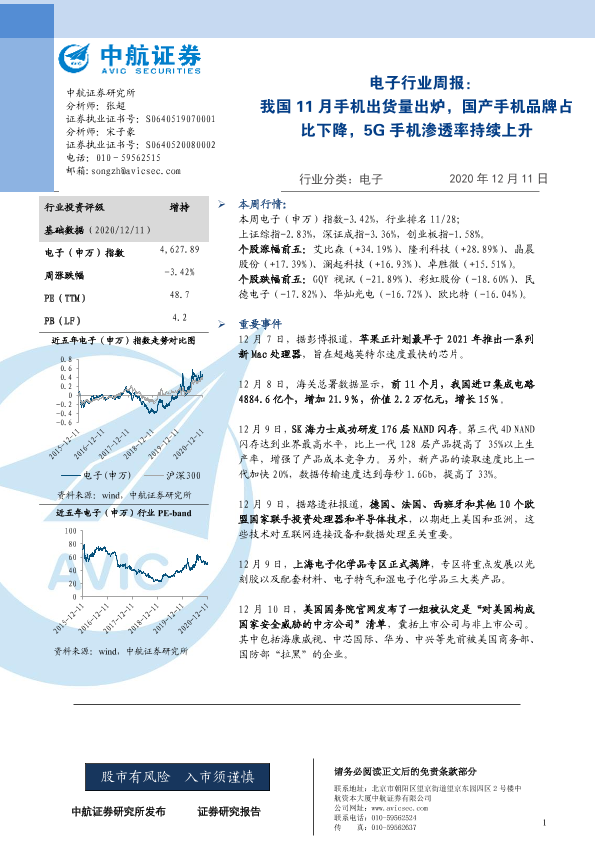 【中航证券】【20201211】电子行业周报:我国11月手机出货量出炉,国产手机品牌占比下降,5G手机渗透率持续上升-5页