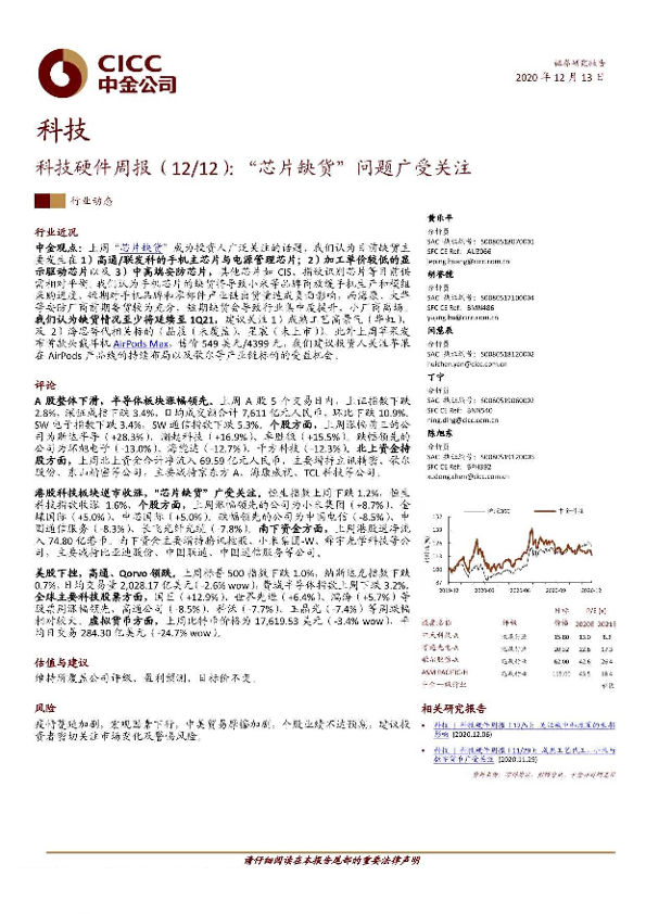 【中金公司】【20201213】科技硬件周报(12 12):“芯片缺货”问题广受关注-13页