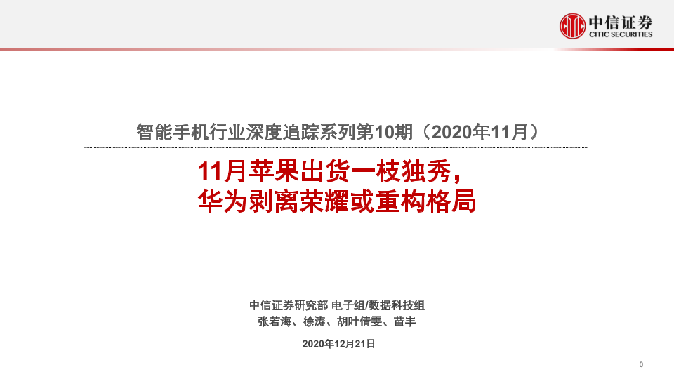 【中信证券】【20201221】20201221-中信证券-智能手机行业深度追踪系列第10期(2020年11月):11月苹果出货一枝独秀,华为剥离荣耀或重构格局-37页