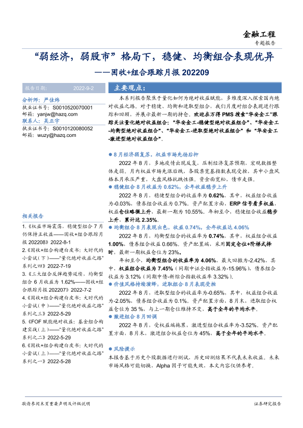 【华安证券】【20220902】“弱经济,弱股市”格局下,稳健、均衡组合表现优异——固收+组合跟踪月报-15页