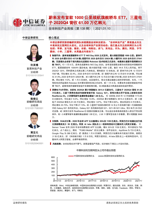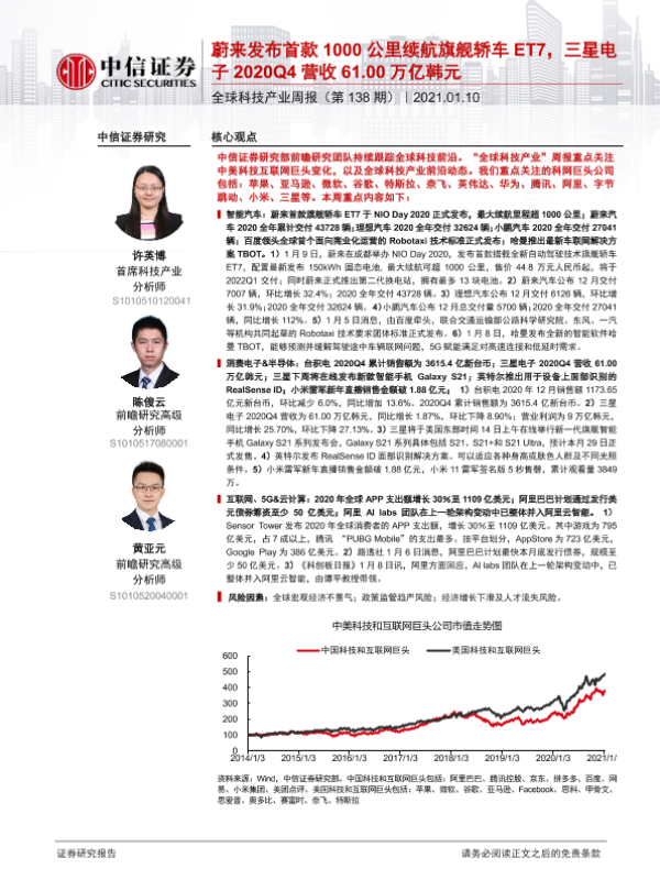 【中信证券】【20210110】全球科技产业周报(第138期):蔚来发布首款1000公里续航旗舰轿车ET7,三星电子2020Q4营收61.00万亿韩元-15页