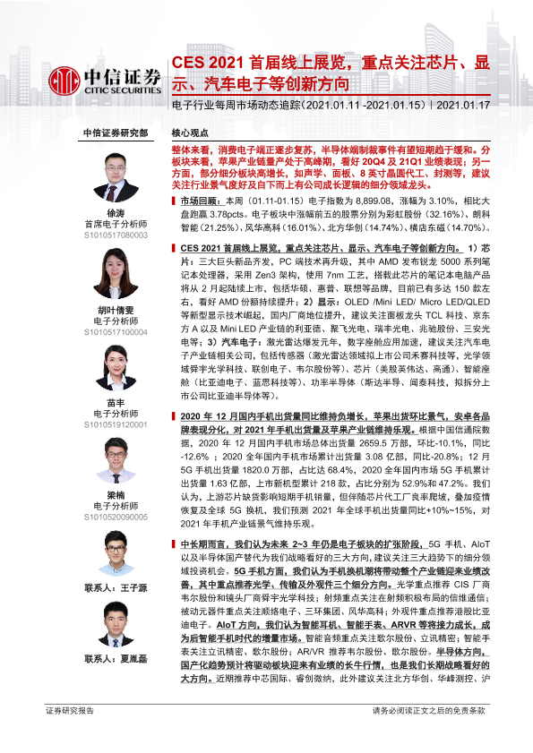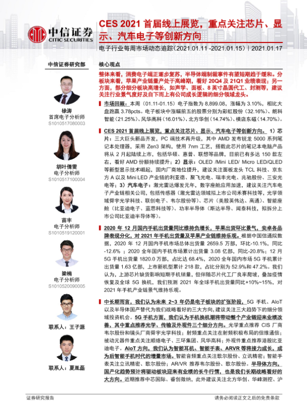 【中信证券】【20210117】20210117-中信证券-电子行业每周市场动态追踪:CES2021首届线上展览,重点关注芯片、显示、汽车电子等创新方向-15页
