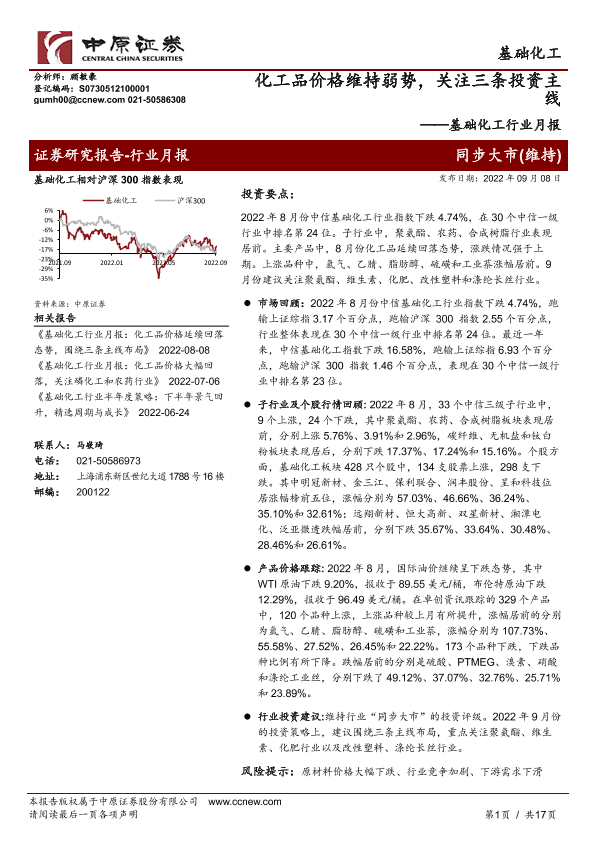 【中原证券】【20220908】基础化工行业月报:化工品价格维持弱势,关注三条投资主线-17页