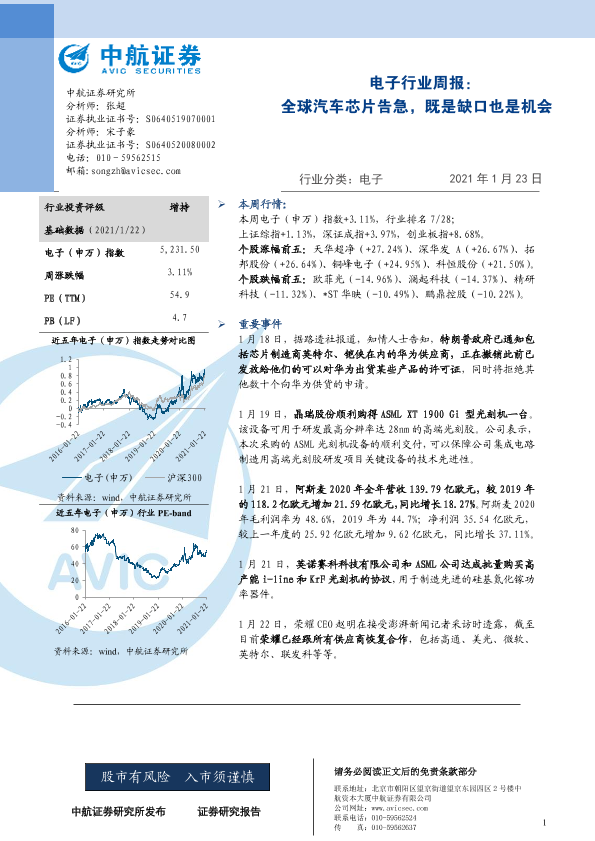 【中航证券】【20210123】电子行业周报:全球汽车芯片告急,既是缺口也是机会-5页