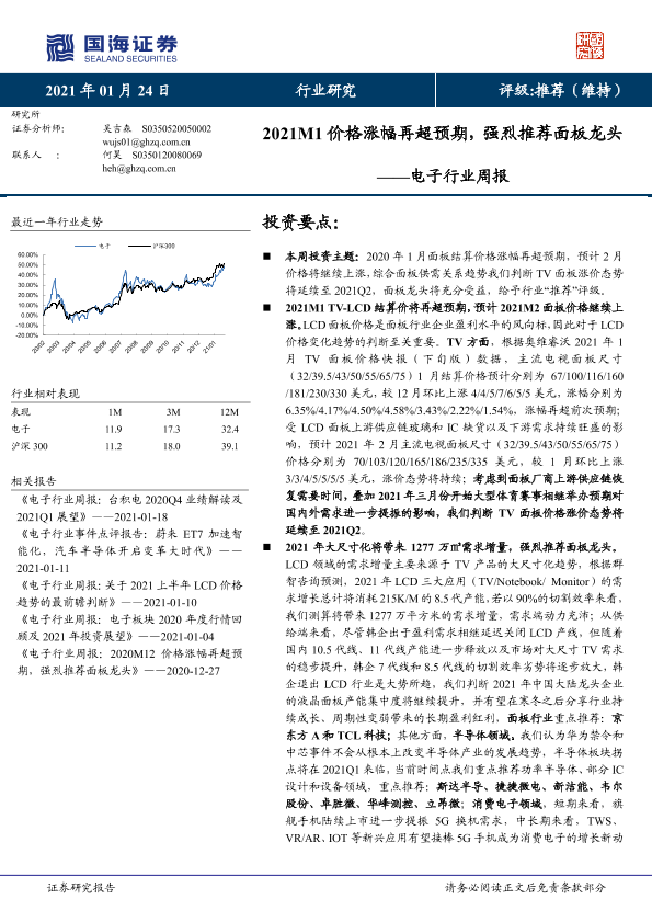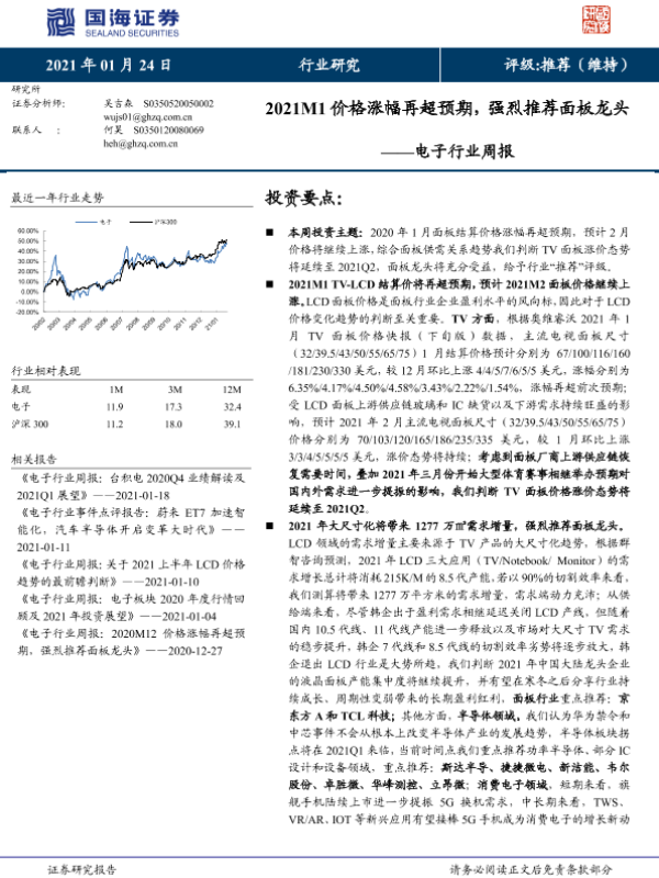 【国海证券】【20210124】20210124-国海证券-电子行业周报:2021M1价格涨幅再超预期,强烈推荐面板龙头-20页