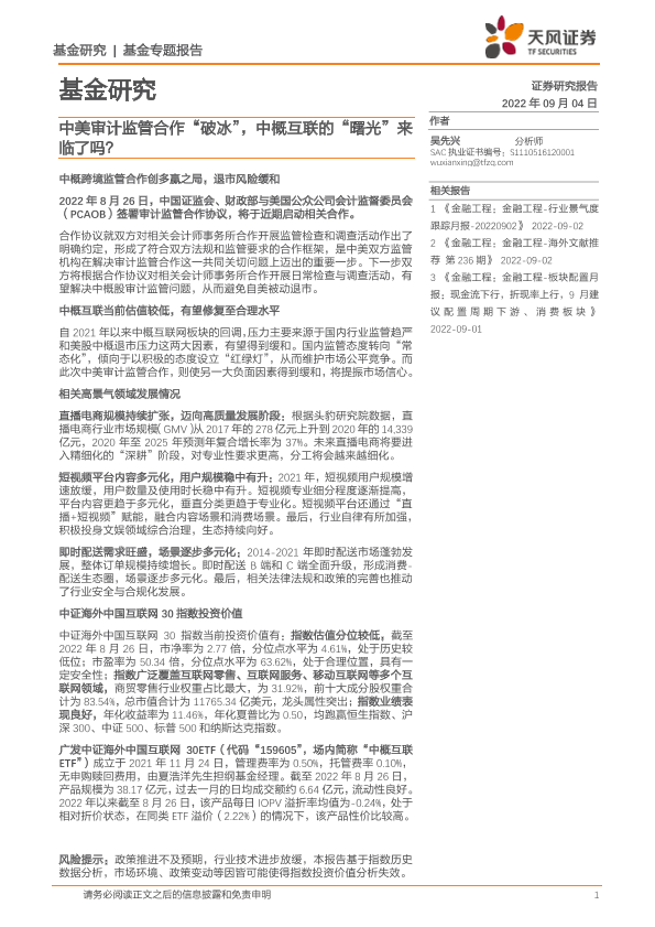 【天风证券】【20220904】中美审计监管合作“破冰”,中概互联的“曙光”来临了吗?-20页