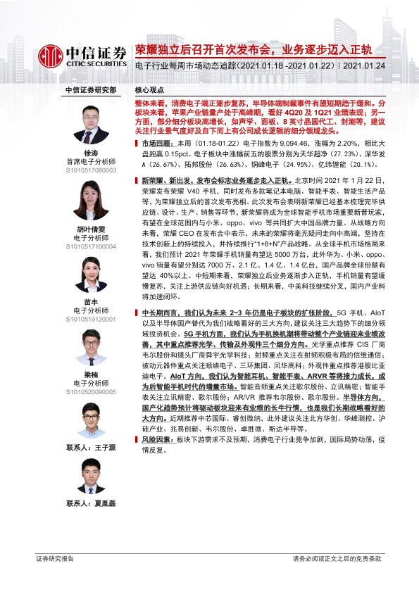 【中信证券】【20210124】电子行业每周市场动态追踪:荣耀独立后召开首次发布会,业务逐步迈入正轨-16页