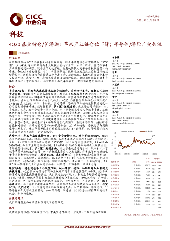 【中金公司】【20210128】4Q20基金持仓/沪港通:苹果产业链仓位下降;半导体/港股广受关注-16页