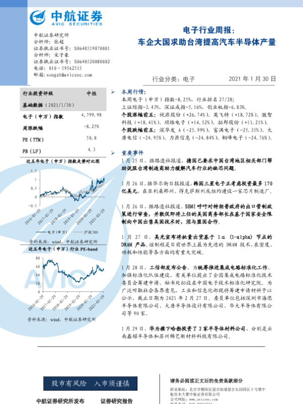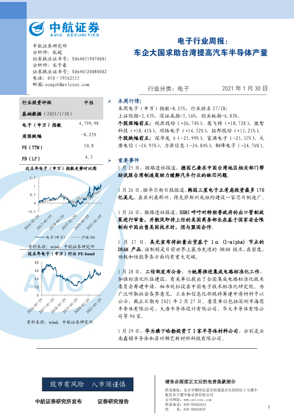 【中航证券】【20210130】电子行业周报:车企大国求助台湾提高汽车半导体产量-5页