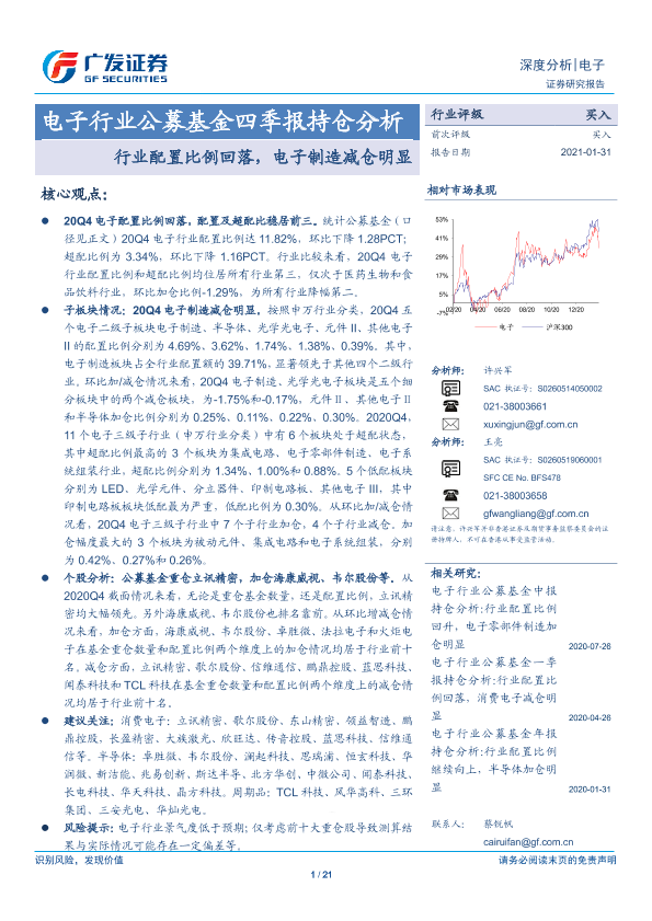 【广发证券】【20210131】电子行业公募基金四季报持仓分析:行业配置比例回落,电子制造减仓明显-21页