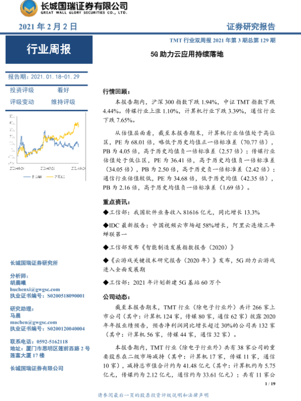 【长城国瑞证券】【20210202】TMT行业双周报2021年第3期总第129期:5G助力云应用持续落地-19页