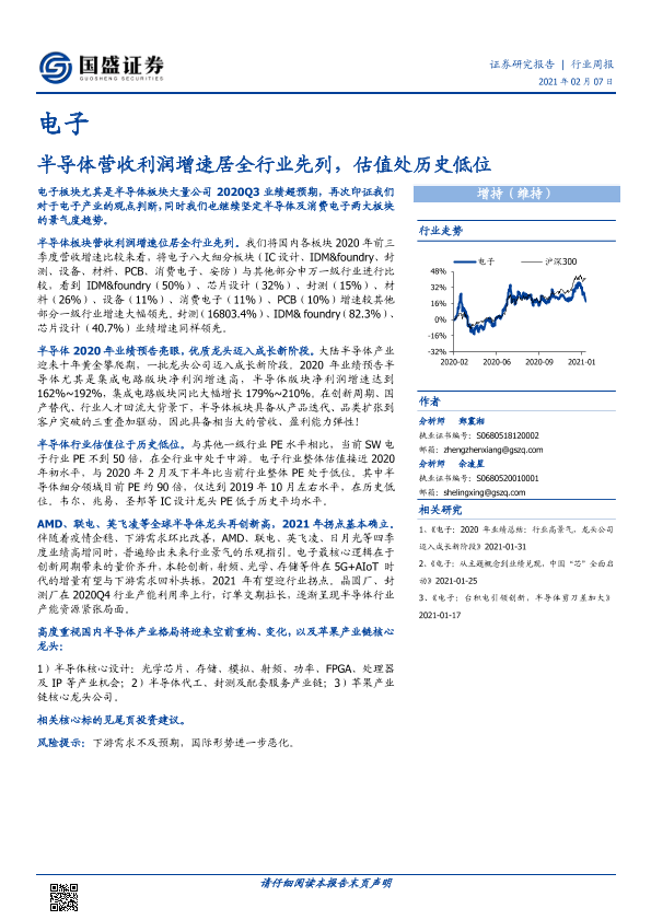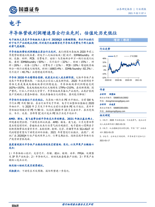 【国盛证券】【20210207】20210207-国盛证券-电子行业周报:半导体营收利润增速居全行业先列,估值处历史低位-16页