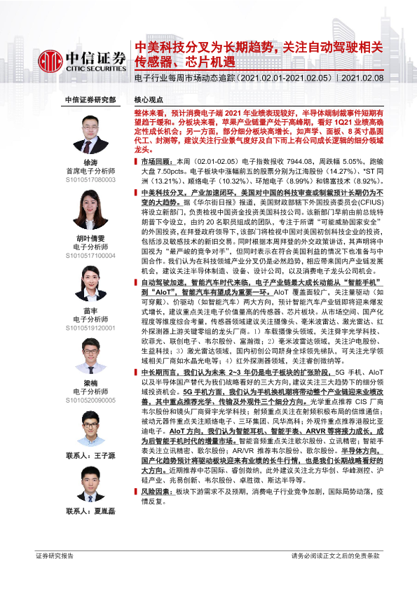 【中信证券】【20210208】20210208-中信证券-电子行业每周市场动态追踪:中美科技分叉为长期趋势,关注自动驾驶相关传感器、芯片机遇-17页
