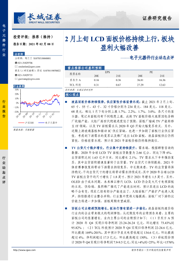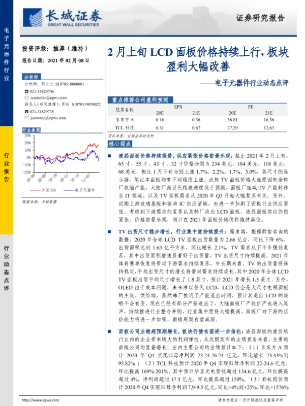 【长城证券】【20210208】20210208-长城证券-电子元器件行业动态点评:2月上旬LCD面板价格持续上行,板块盈利大幅改善-3页