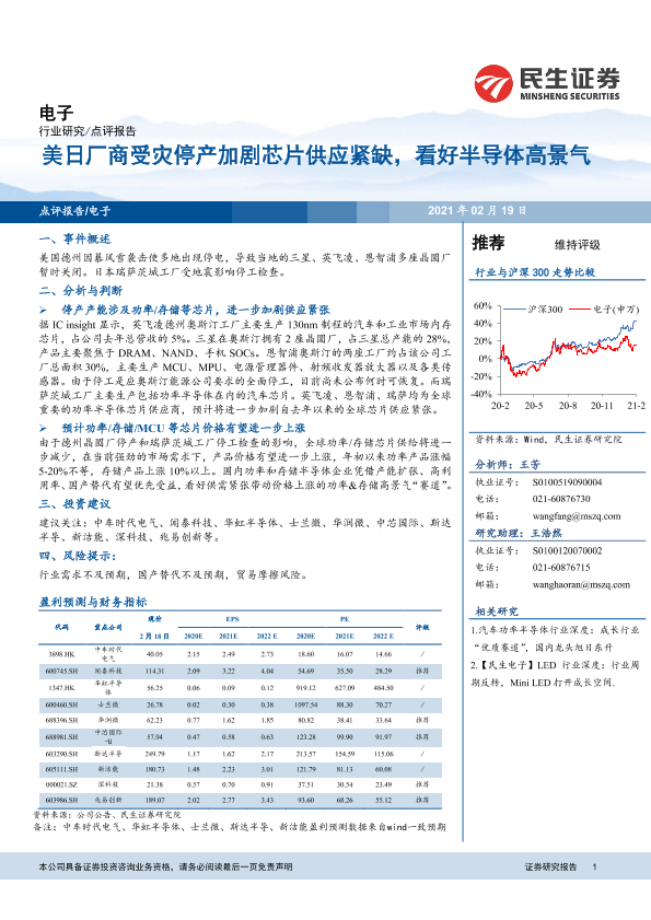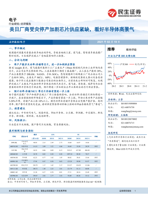 【民生证券】【20210219】美日厂商受灾停产加剧芯片供应紧缺,看好半导体高景气-3页