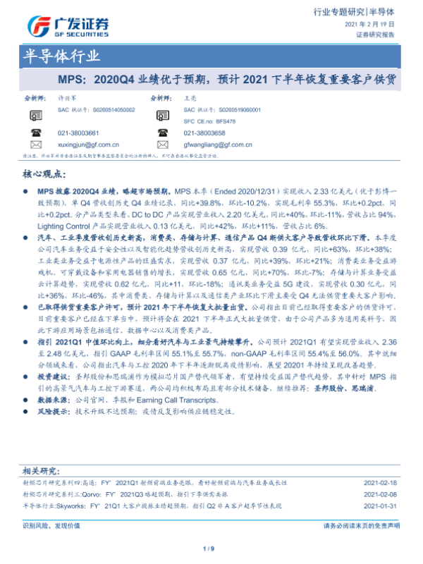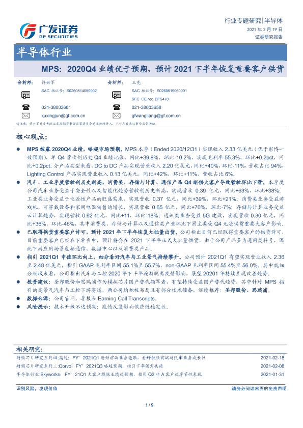 【广发证券】【20210219】20210219-广发证券-半导体行业专题研究:MPS:2020Q4业绩优于预期,预计2021下半年恢复重要客户供货-9页