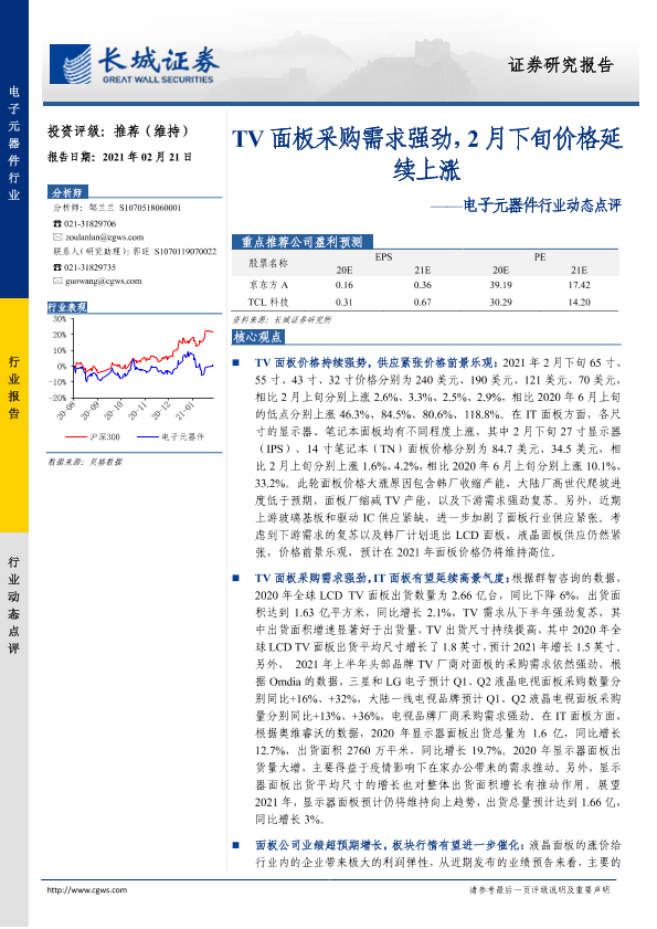 【长城证券】【20210221】电子元器件行业动态点评:TV面板采购需求强劲,2月下旬价格延续上涨-3页