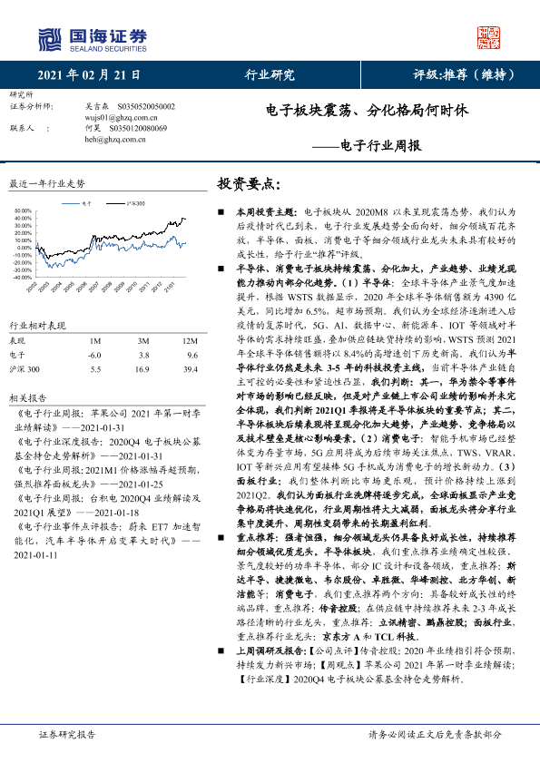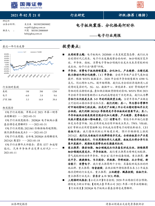 【国海证券】【20210221】电子行业周报:电子板块震荡、分化格局何时休-21页