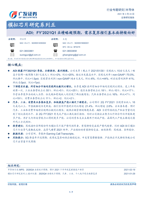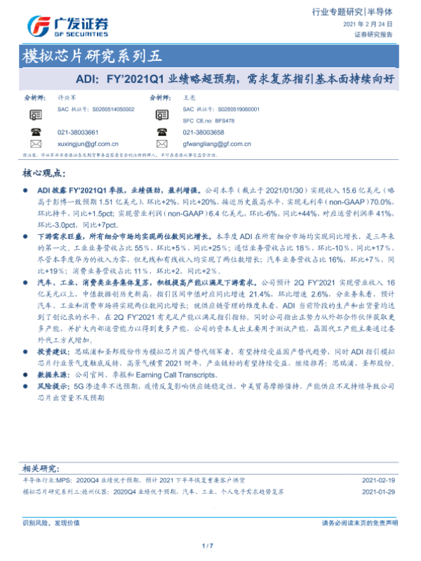 【广发证券】【20210224】ADI:FY’2021Q1业绩略超预期,需求复苏指引基本面持续向好-7页