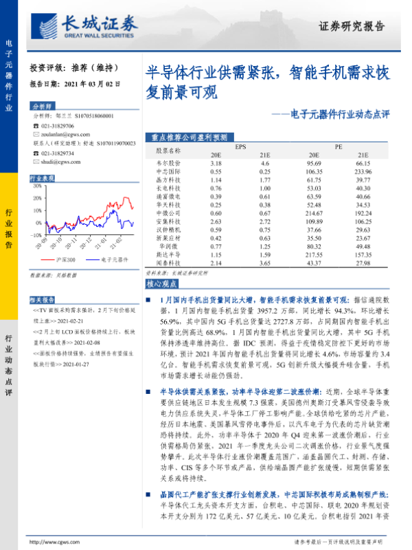 【长城证券】【20210302】20210302-长城证券-电子元器件行业动态点评:半导体行业供需紧张,智能手机需求恢复前景可观-3页