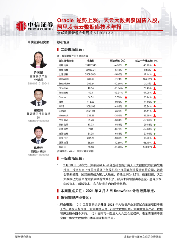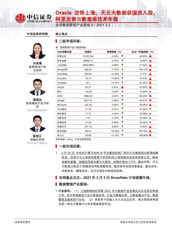 【中信证券】【20210302】全球数据管理产业周报5:Oracle逆势上涨,天云大数据获国资入股,阿里发表云数据库技术年报-13页