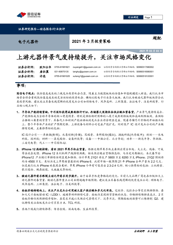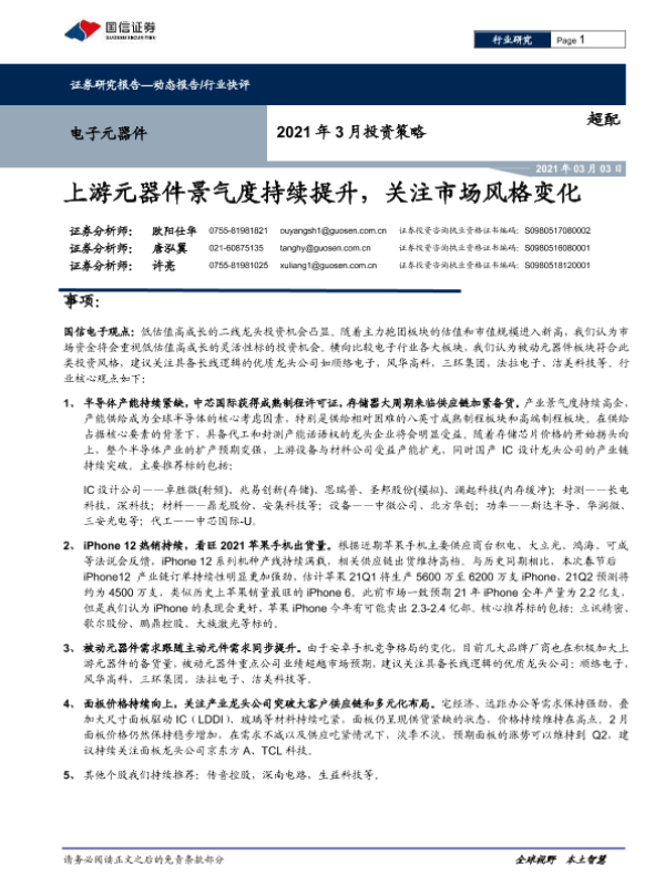 【国信证券】【20210303】电子元器件2021年3月投资策略:上游元器件景气度持续提升,关注市场风格变化-12页