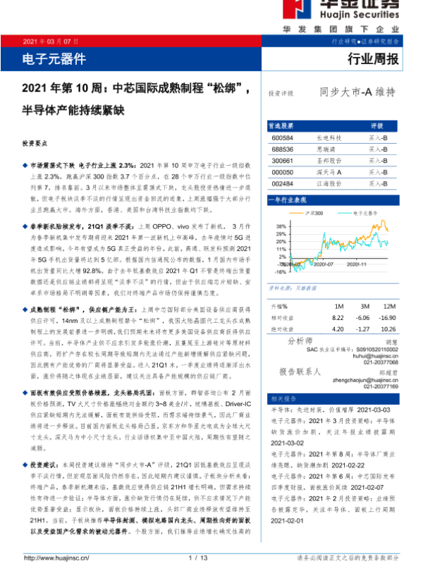 【华金证券】【20210307】电子元器件2021年第10周:中芯国际成熟制程“松绑”,半导体产能持续紧缺-13页