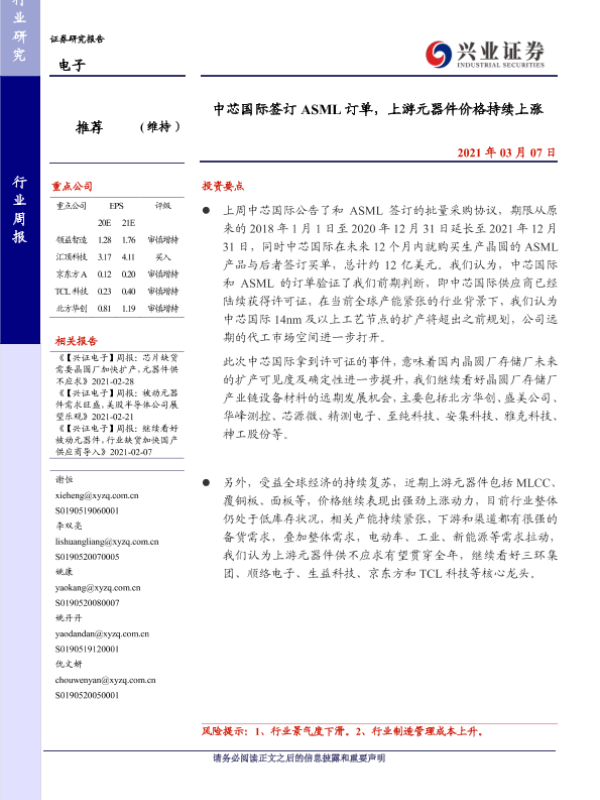 【兴业证券】【20210307】中芯国际签订 ASML订单,上游元器件价格持续上涨-8页