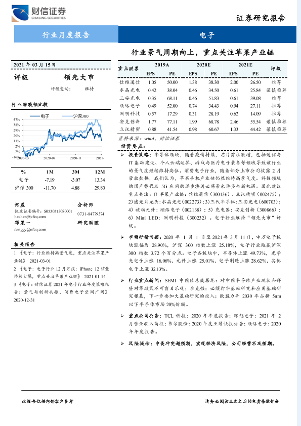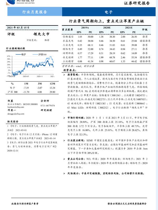 【财信证券】【20210315】电子行业月度报告:行业景气周期向上,重点关注苹果产业链-11页
