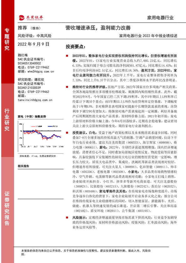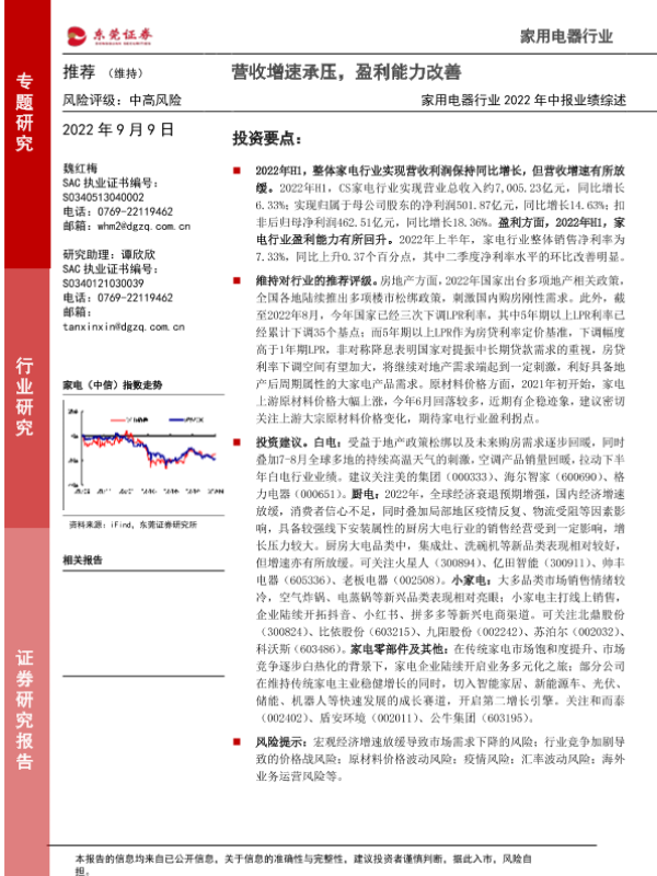 【东莞证券】【20220909】家用电器行业2022年中报业绩综述:营收增速承压,盈利能力改善-33页