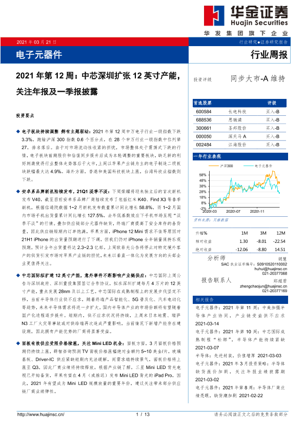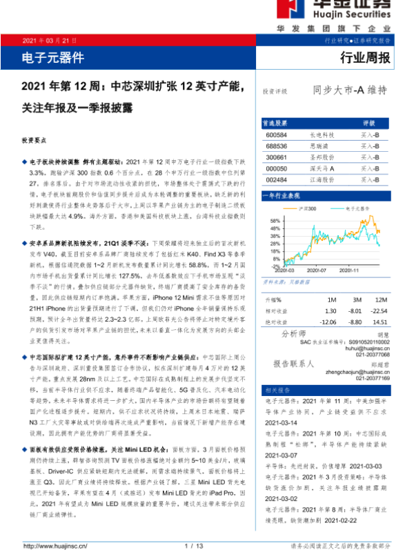 【华金证券】【20210321】电子元器件2021年第12周:中芯深圳扩张12英寸产能,关注年报及一季报披露-13页