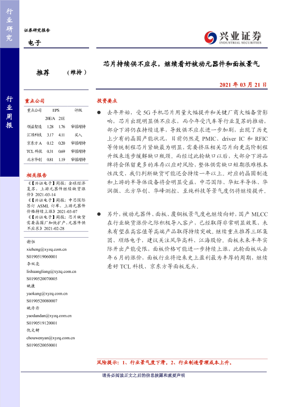 【兴业证券】【20210321】20210321-兴业证券-电子行业周报:芯片持续供不应求,继续看好被动元器件和面板景气-9页